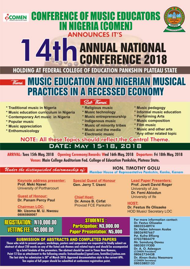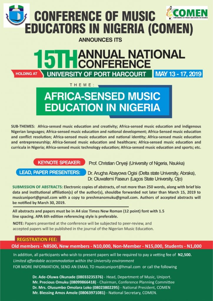 The theme of that first conference which held from 1st March to 4th March , 2000 was: Issues in Music Education: Way Forward in the 21st century.