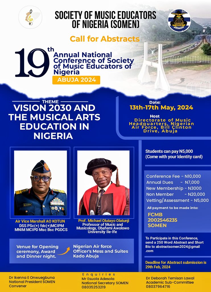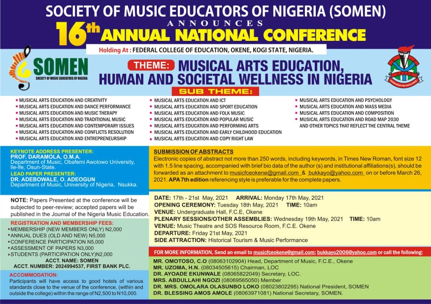 At the conference in Abeokuta it was unanimously agreed to expand the coast of the association by adopting a name that would accomodate all music educators without institutional dichotomy. The association, thereafter, adopted the nomenclature; Conference of Music Educators in Nigeria. (COMEN). Later, in 2019, due to certain requirements brought up within the registration process, the group’s nomenclature was revised to become; Society of Music Educators of Nigeria (SOMEN).