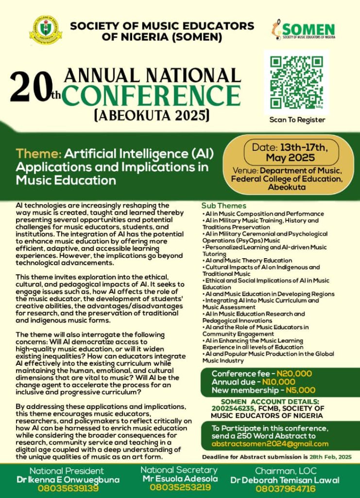 With the increasing number of seasoned music educators of highest academic ranking who are registered members of the society; the society is wired to monitor, supervise and engage in activities that would improve the quality of music graduates in Nigeria.Because the society recognises that teaching is a dynamic profession that requires constant knowledge update for effective dissemination of learning objectives.